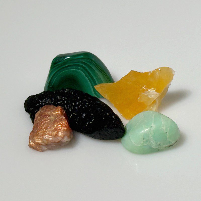 Calcit-orange, Krysopras, Malakit, Solsten-rå, Tektit.